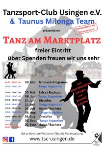 Auch in diesem Jahr laden wir alle Tanzbegeisterten ein zu unserer Open-Air-Veranstaltung Tanz am Marktplatz. Einmal im Monat rollen wir den Tanzboden aus und freuen uns über tanzende und zuschauende Gäste. Bei hoffentlich angehmen Temperaturen gibt es südlichen Flair im Taunus. Im Wechsel laden wir zu Salsa/Bachata und Discofox ein.
